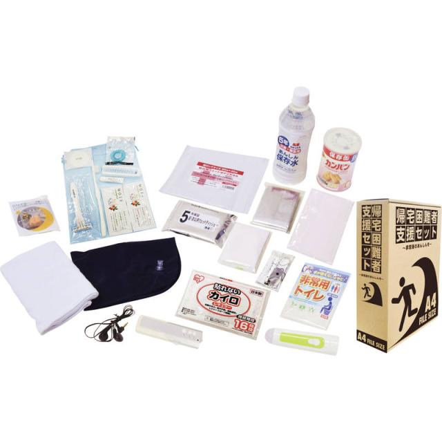 ハンディライト、コンパクトFMラジオ(電池別売)、防寒シート、保存水(5年保存)500mL、カンパン(5年保存・小麦・乳)100g、非常用トイレ、防災用ウェットティッシュ20枚、アイマスク、耳栓、宿泊セット用ポーチ、カミソリ、ハブラシ、二つ折りコンパクトブラシ、シャンプー&コンディショナー、石鹸、タオル、ヘアーバンド、カイロ、ポケットティッシュ8W、緊急用ホイッスル、ウエットボディタオル、エアー枕、マスク