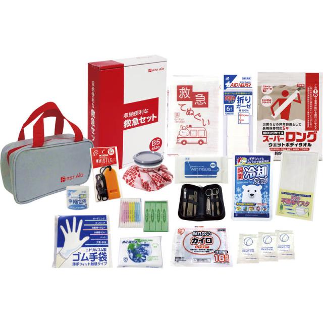 収納ポーチ(80×235×130mm)・カイロ・ホイッスル・折りガーゼ・ゴム手袋・マスク・エチケット6点セット・救急てぬぐい・ひょうのう・包帯・ボディタオル・絆創膏5P・水に流せるティッシュ・ウェットティッシュ・瞬間冷却パック×各1・ハンドジェル×3・綿棒10P×1