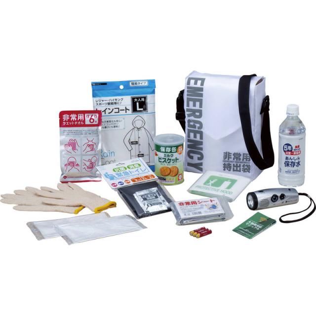 防災ミニショルダーバッグ(185×85×305mm)、ラジオライト、長期保存アルカリ単4乾電池×3、ミルクビスケット(小麦・乳、5年)、あんしん保存水(5年)500mL、緊急トイレ2回分、静音タイプアルミシート、個包装マスク×2、防災ウェットタオル、軍手、けむりフード、レインコートLサイズ、大地震対応防災マニュアル