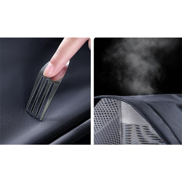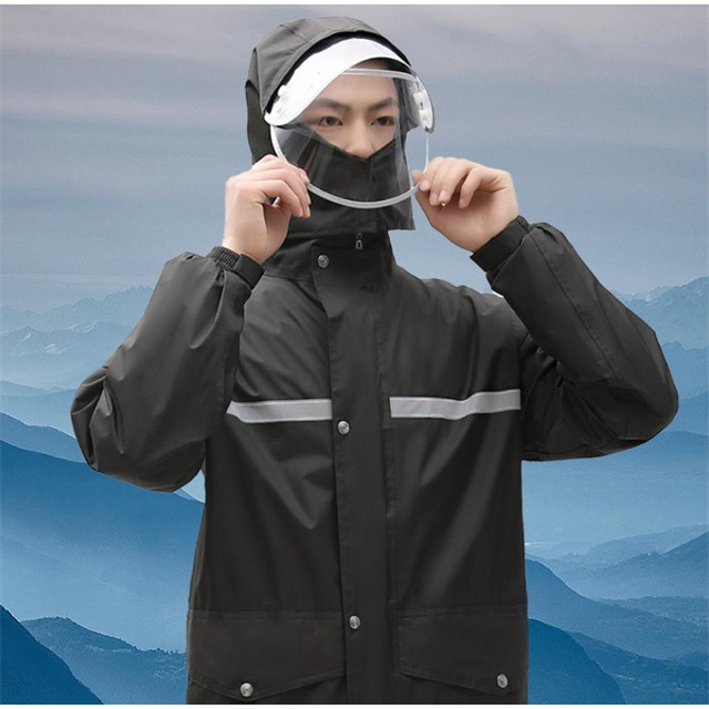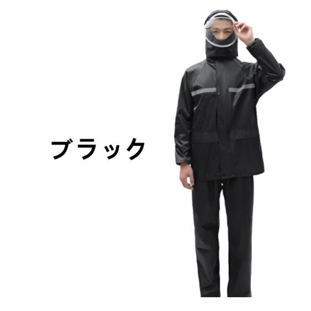 顔が雨に濡れにくく、視界を遮らないダブルバイザー付きのレインウェア上下セット。バイザーは取り外しが可能で、折りたたむときにも邪魔にならずに便利なレインウェア上下セットです。