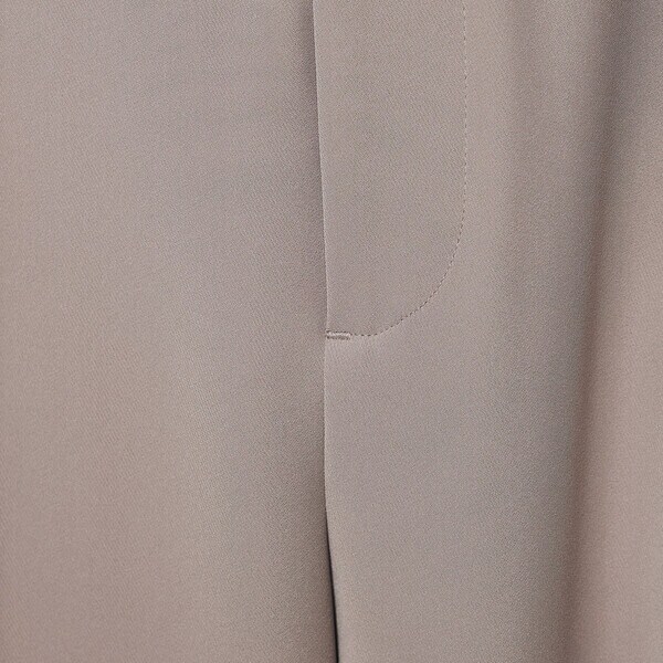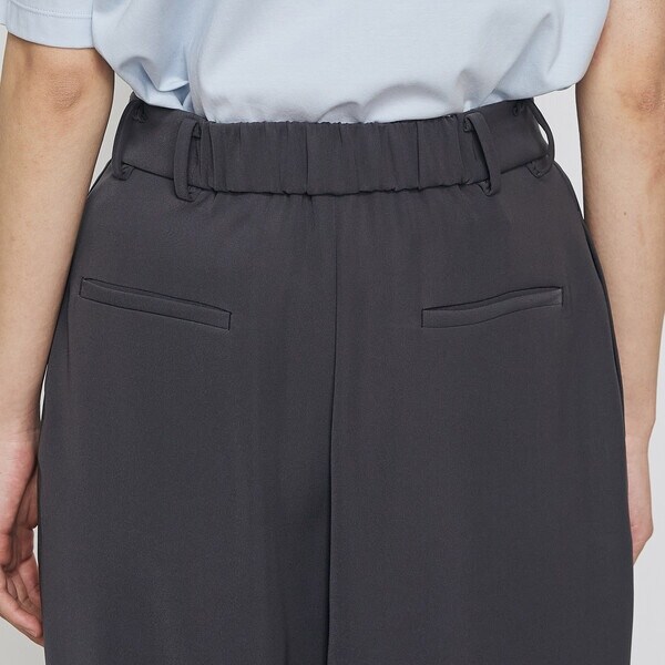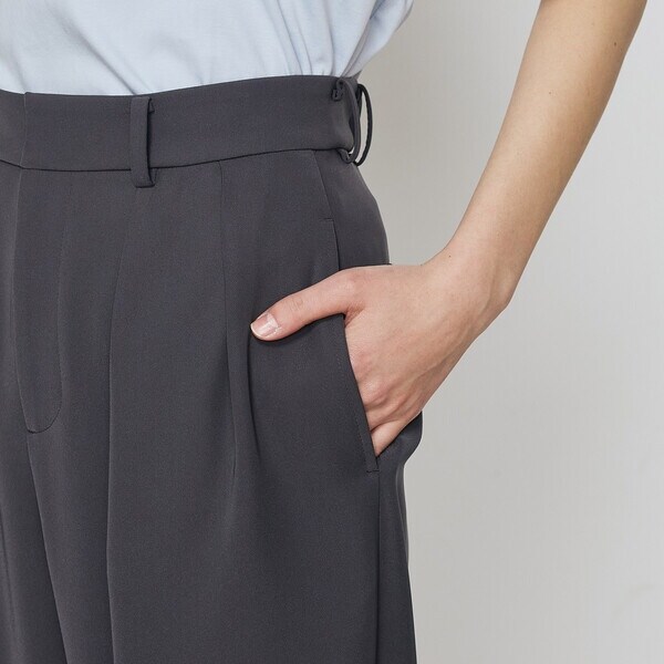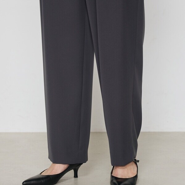 ウエストはタックで分量感を出し、裾に向けて絞った丸みのあるシルエットは、足のラインをひろいにくく、すっきりとして見えます。