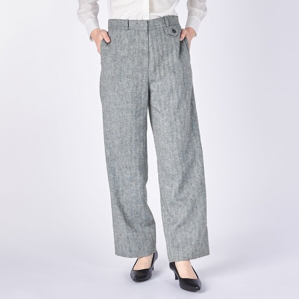 ヘリンボーン生地で仕立てたパンツ。軽やかなムードのカラーで、スタイリッシュな着こなしを演出します。フロント左の飾りポケットがデザインアクセント。履きこなしやすいストレートワイドシルエット。おしゃれなムードときちんと感を兼ね備え、プライベートでもビジネスシーンでも活躍する万能なアイテムです。