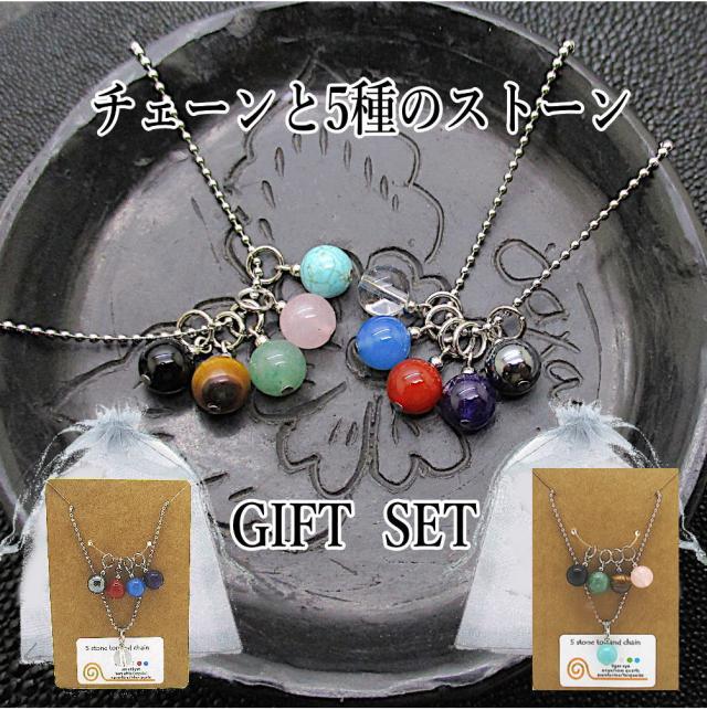 チェーン1本と天然石5個のセットです。ギフト用の台紙とシフォン袋が付いているのでちょっとした贈り物にもぴったり。