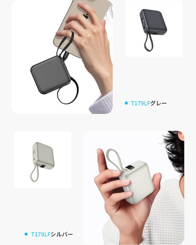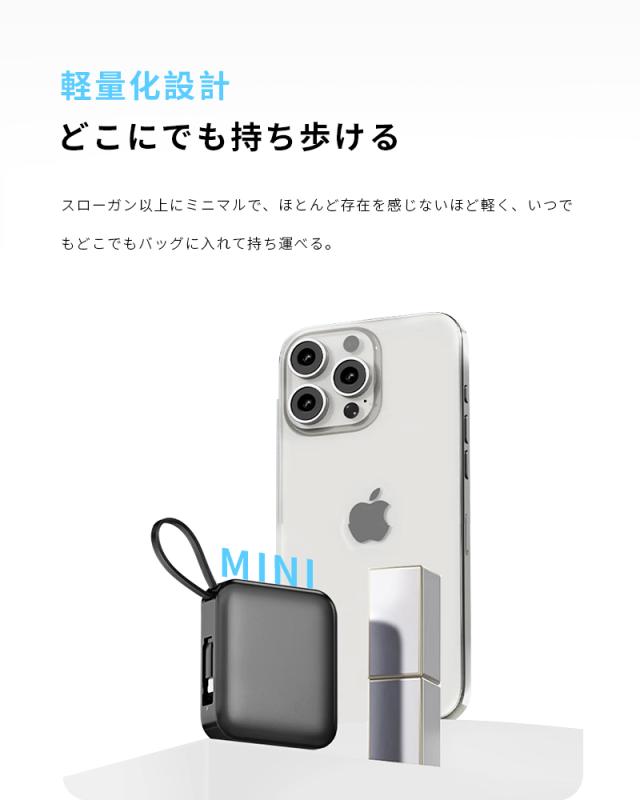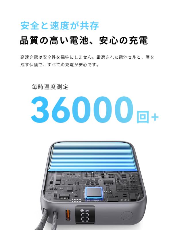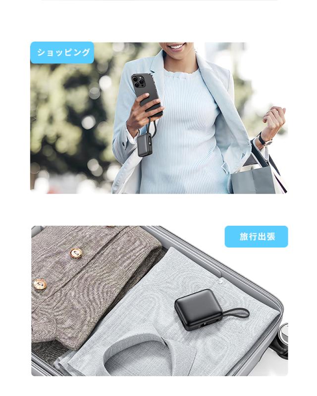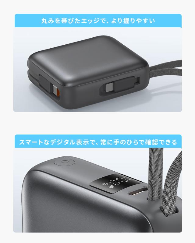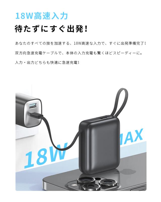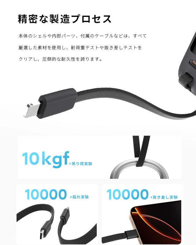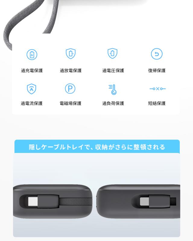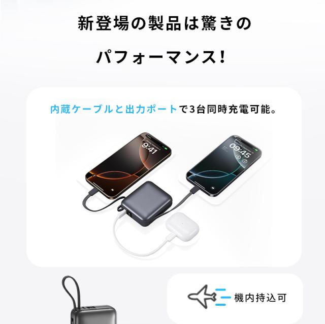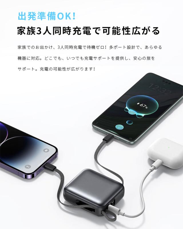 内蔵ケーブルで直接充電、ケーブルを持ち忘れても大丈夫です。iPhone/Type-C出力ケーブルとType-C出力ポートで、3台の設備も同時に充電できるため、外出先などでご家族や友達とシェアすることもできます。さらに、Type-CケーブルとType-Cポートは入力も対応しており、急速に蓄電でき、バッテリー本体の充電もスピーディー。