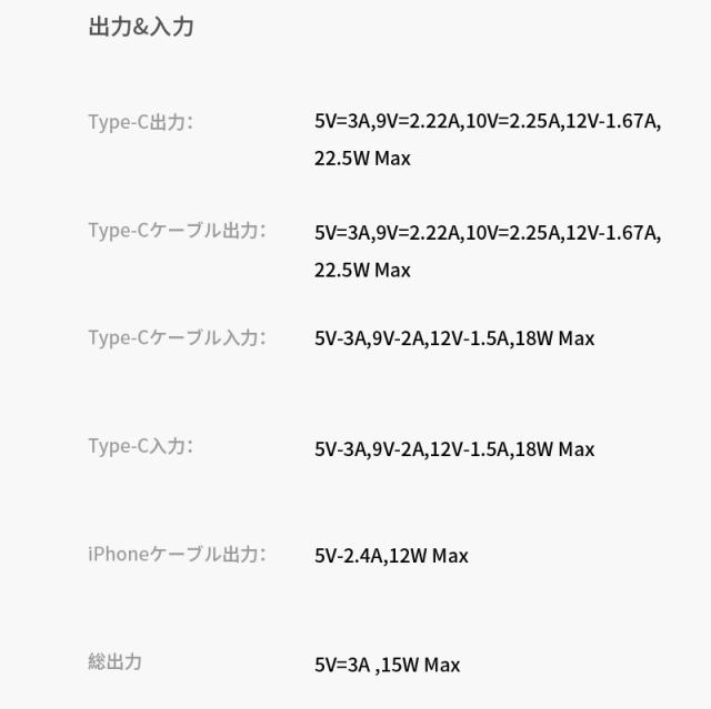 Type-Cケーブル出力:5V/3A 9V/2.22A 10V/2.25A 12V/1.67A 22.5W Max