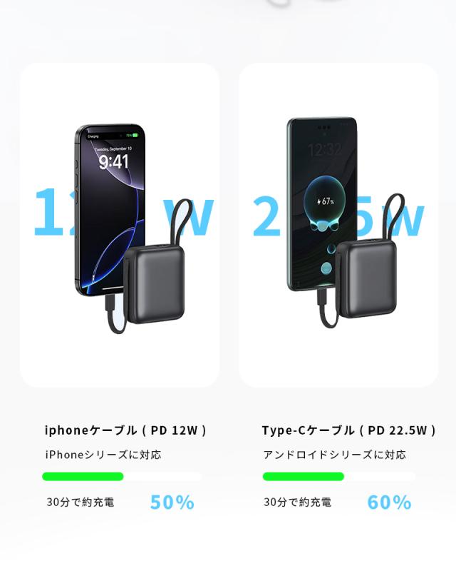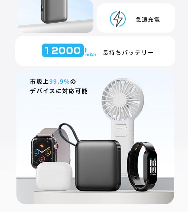 【2025年最新型】モバイルバッテリー 12000mAh 64.2Wh 大容量 3台同時充電 iPhone17/16充電 PD22.5W 防災電源 2本ケーブル内蔵 USB-A / Type-C / iPhone 出力 Type-C入力 QC3.0 急速充電 安全保護機能搭載 高品質 コンパクト 防災グッズ PSE認証 【PL保険加入済み製品・安心】