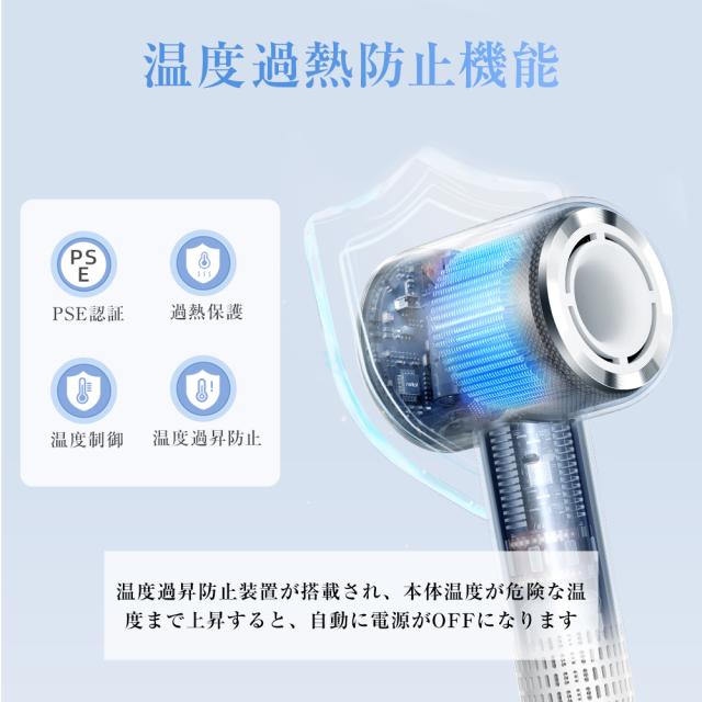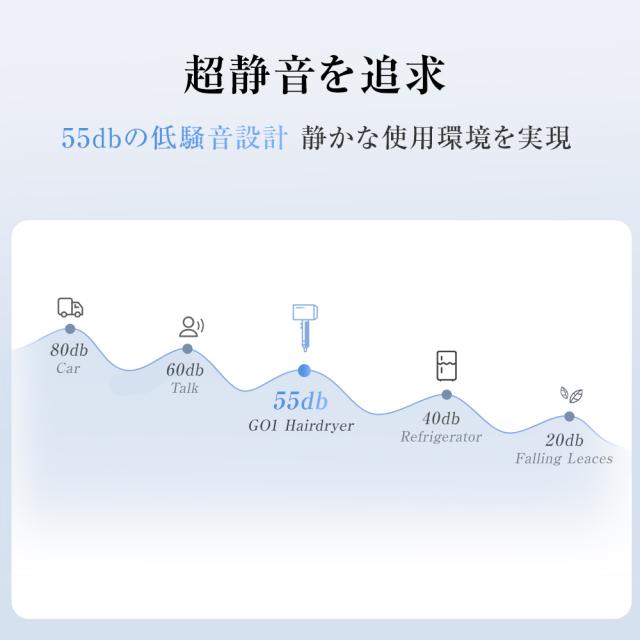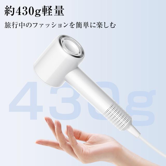 NTC温度検知チップとAI温度制御二重検知機能により、毎秒100回の温度検知を行います。過熱保護機能も搭載されており、本体が105°まで上昇すると自動的に電源を切れます。熱を溜めにくく、熱ダメージ抑えてソフトな風を毛先に届け、リアルタイムで風温をコントロールし温度過昇をを防ぎ、安全・安心にお使いいただけます。430gの軽量で長時間持っても疲れにくく、美容師にも好評です。