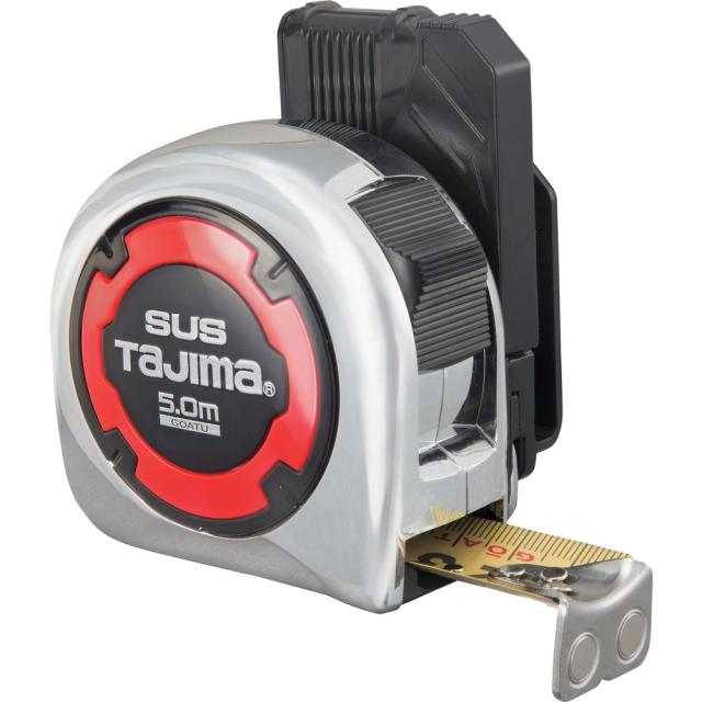 ●剛性力1.3倍(当社比)の剛厚ステンテープを採用しています。●片手で簡単脱着できる、落下防止用ベルトホルダー付です。●0点補正移動爪です。●本体に収納できる安全ロープ取付環です。●3点カシメプロテクター採用でテープ先端補強しています。●爪強度2.5倍※当社従来爪との比較テスト比●テープ長さ(m):5●テープ幅(mm):25●水平保持(m):2.4●目盛仕様:メートル目盛●爪仕様:移動爪●0点補正移動爪:○●455ピッチ表示:○●ショックアブソーバー:あり●テープ色:黄●本体寸法(mm):88●テープ厚さ(mm):0.135●色:黒/赤●テープ:両面剛厚ステンイエローテープ●表示:ヨンゴーゴーピッチ表示付●バネ:ステンレスバネ(SUS301)使用●付属:落下防止セフ付●ベルトクリップ無し●ベルトホルダー付き 質量330g