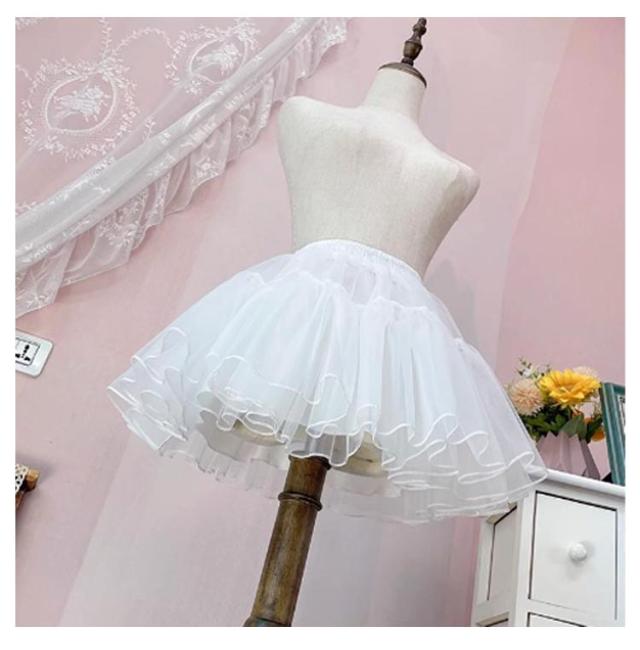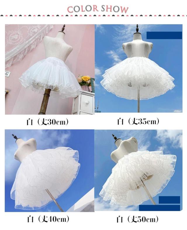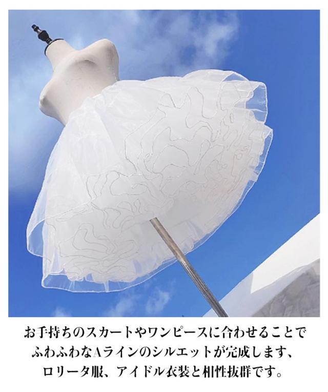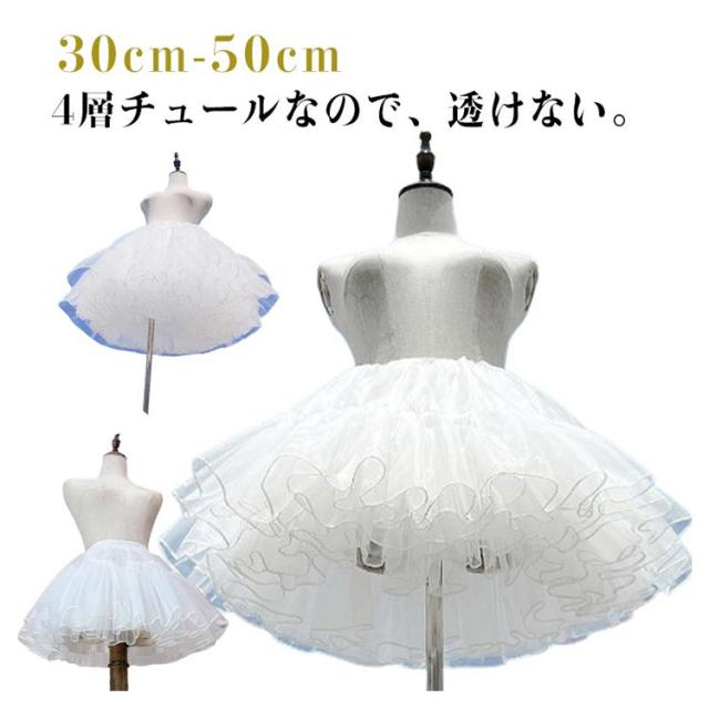 | 4層チュールなので、透けない。 どんなドレスもふわふわに!ボリュームアップ! フワフワな質感で着心地も抜群! 素材は柔らかいなので、肌触りがいい。 お手持ちのスカートやワンピースに合わせることでふわふわなAラインのシルエットが完成します、ロリータ服、アイドル衣装と相性抜群です。 | |