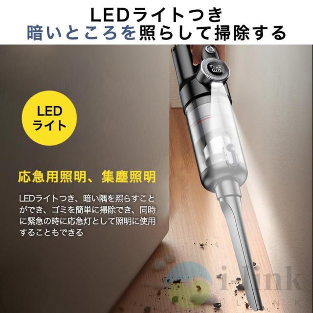 コードレス掃除機のパワーヘッドの先端に明るいLEDライト4つを搭載、ソファやベッドの下、家具の裏など日中でも暗い場所掃除しやすく配慮されています。掃除機は左右に180°、上下に90°回転するヘッドが利用されており、低い位置の掃除を行うとき、床に対して平行に近い角度までヘッドが曲がり、掃除を快適に行え、最大限の機動性を提供します。低騒音化設計で気になる運転音を軽減します。夜や早朝のお掃除にもおすすめします。