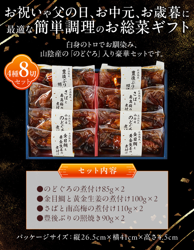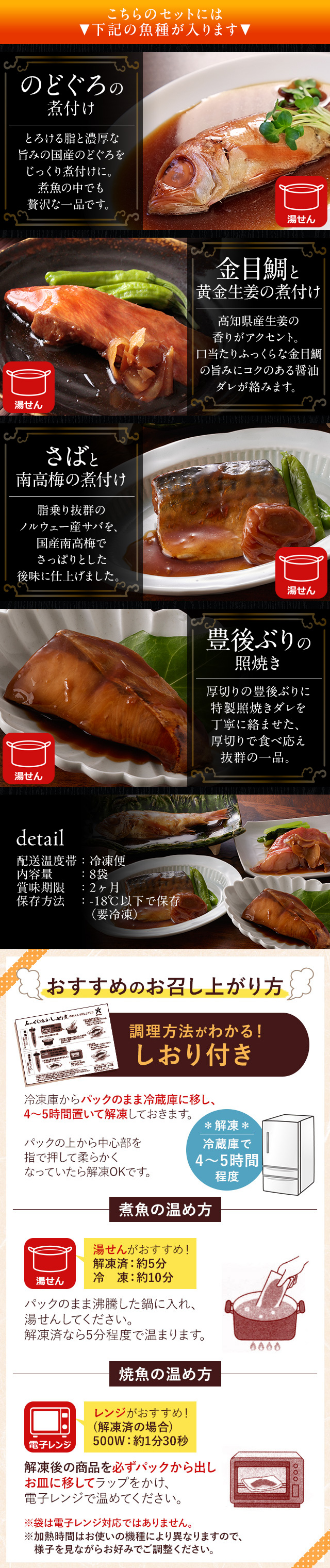 | 内容量 | 【のどぐろの煮付け】85g×2袋 【金目鯛と黄金生姜の煮付け】100g×2袋 【さばと南高梅の煮付け】110g×2袋 【豊後ぶりの照焼き】90g×2袋 |