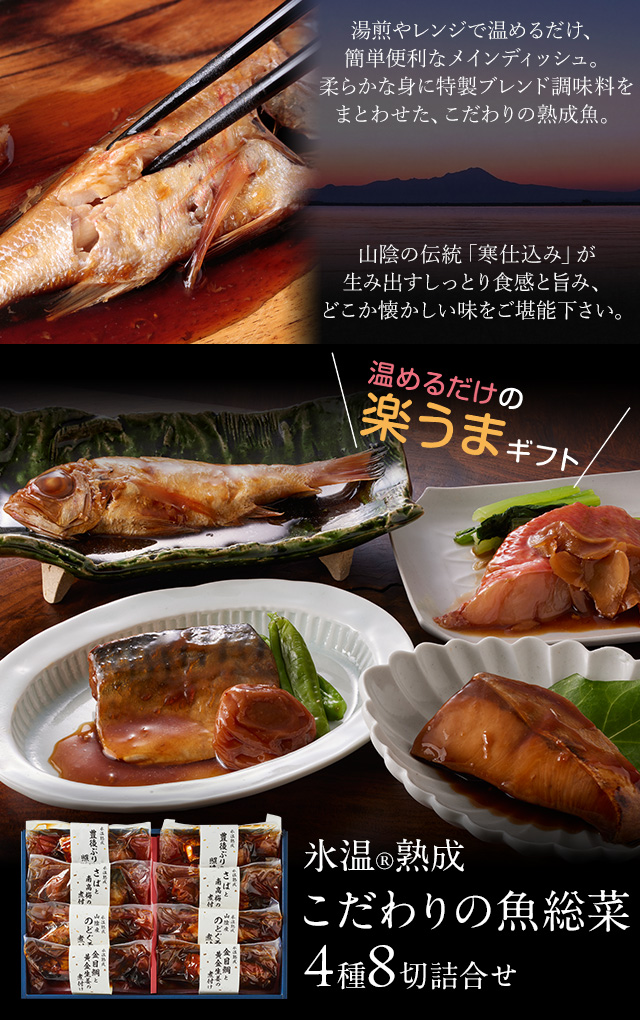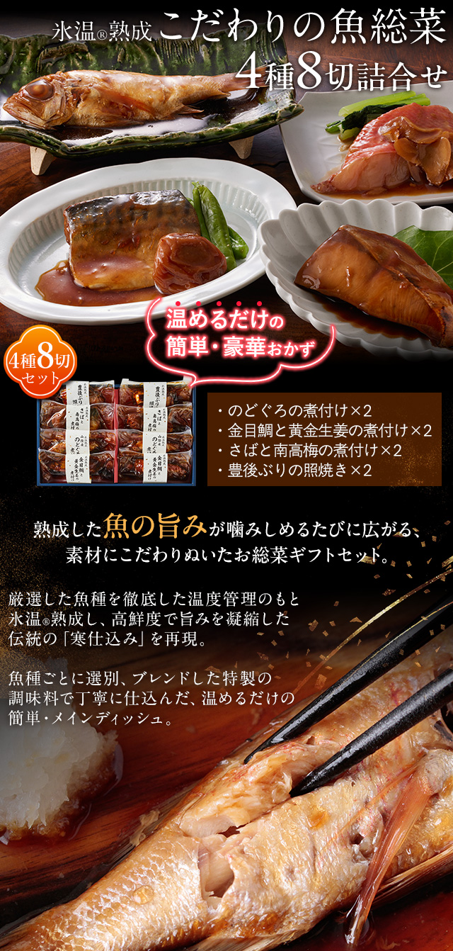 お歳暮 ギフト 氷温熟成 こだわりの魚総菜4種詰合せ(のどぐろの煮付け・金目鯛の煮付けほか8切入) プレゼント ギフト 送料無料(北海道・沖縄を除く)