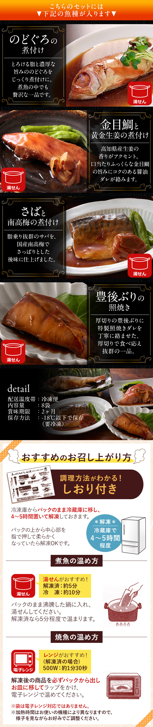 | 内容量 | 【のどぐろの煮付け】85g×2袋 【金目鯛と黄金生姜の煮付け】100g×2袋 【さばと南高梅の煮付け】110g×2袋 【豊後ぶりの照焼き】90g×2袋 |