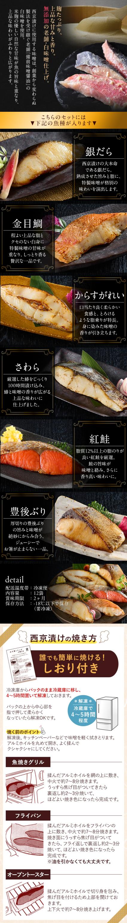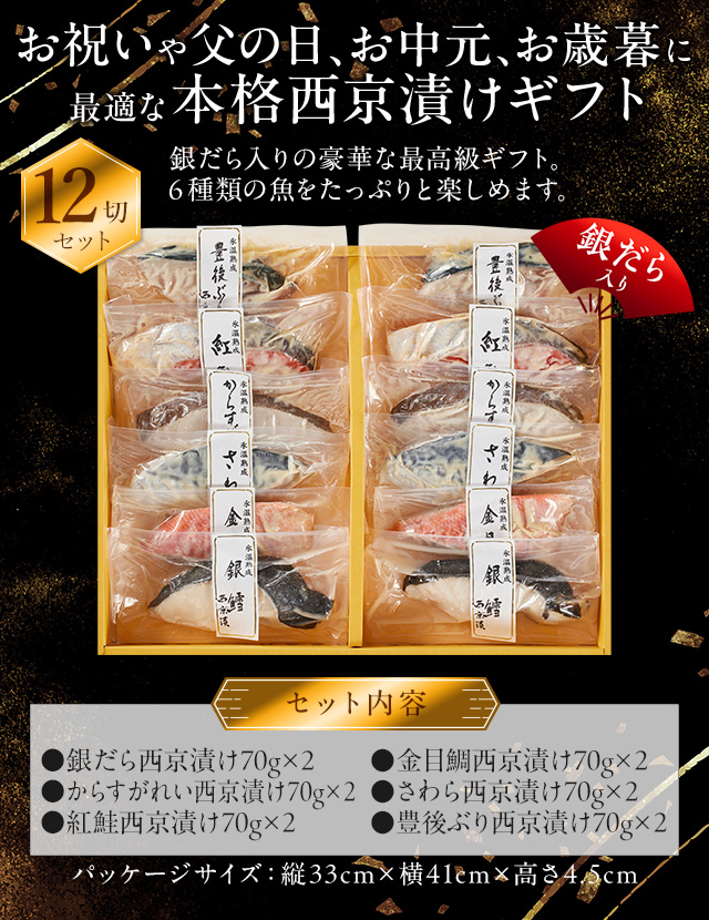 | 内容量 | 【銀だら西京漬け】70g×2袋 【金目鯛西京漬け】70g×2袋 【からすがれい西京漬け】70g×2袋 【さわら西京漬け】70g×2袋 【紅鮭西京漬け】70g×2袋 【豊後ぶり西京漬け】70g×2袋 |