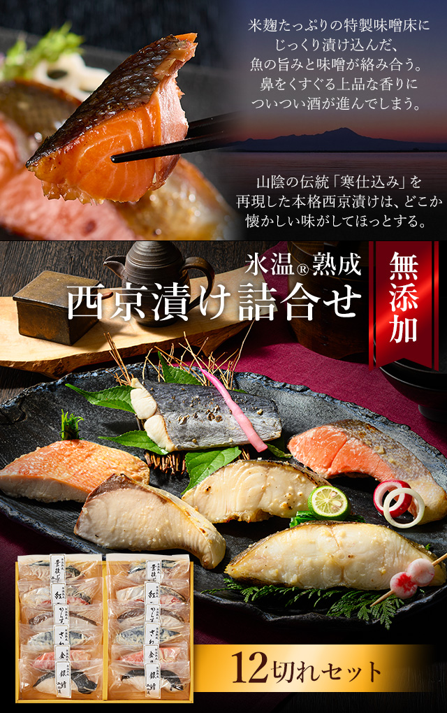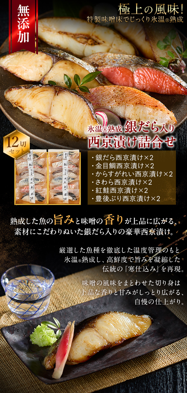 お歳暮 ギフト 銀だら入り 西京漬け 詰合せ(銀だら・金目鯛・からすがれいほか12切入) 氷温熟成 無添加 漬け魚 プレゼント ギフト 送料無料(北海道・沖縄を除く)