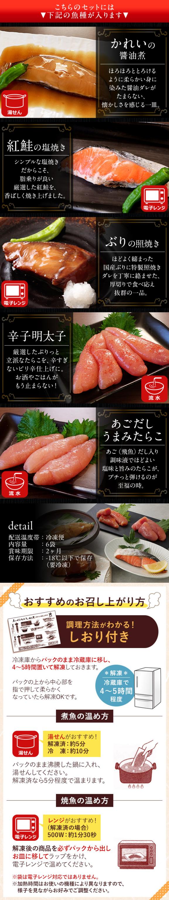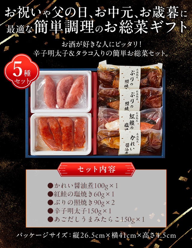 | 内容量 | 【かれいの醤油煮】100g×1袋 【紅鮭の塩焼き】60g×1袋 【ぶりの照焼き】90g×2袋 【辛子明太子】150g×1袋 【あごだしうまみたらこ】150g×1袋 |