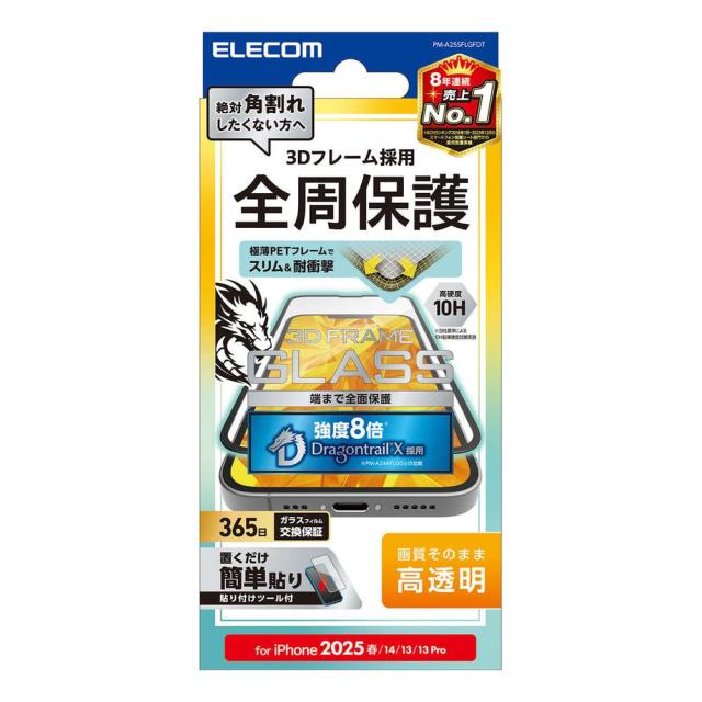 エレコム PM-A25SFLGFDT iPhone 16e / 14 / 13 / 13 Pro用 ガラスフィルム 高透明 全面保護 365日保証 強化ガラス Dragontrail(R)X 表面硬度10H 角割れ防止 フレーム付 指紋防止 飛散防止 貼り付けツール付 気泡防止[PMA25SFLGFDT] 返品種別A