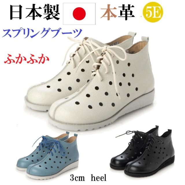 日本製 本革 レザーブーツ スプリングブーツ パンチングレザー スプリングブーツ ブーツ 幅広 5e 外反母趾 カジュアル ソフトレザー ふかふかインソール サイドジッパー 履きやすい 脱ぎやすい 歩きやすい 涼しい おしゃれ