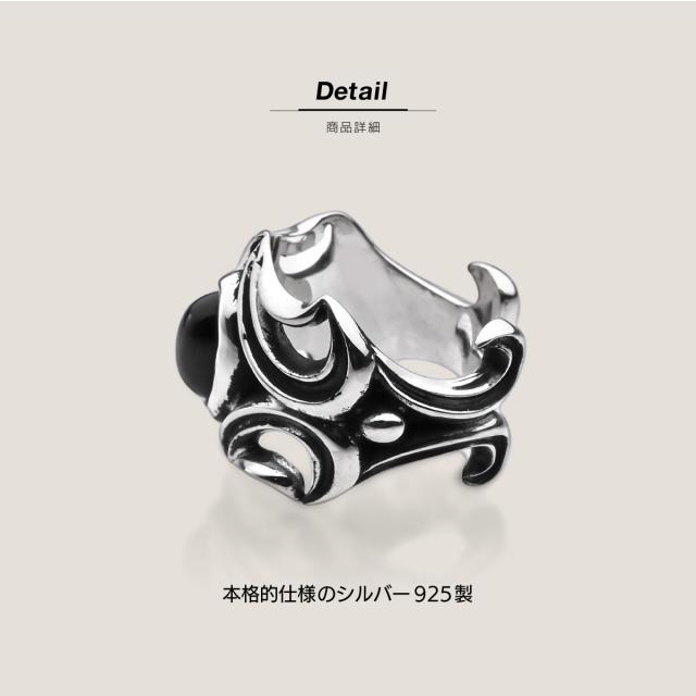 大ぶりのオーバル型オニキスと曲線的なシルバーフレームが融合した、存在感抜群のシルバー925製のイヤーカフです。滑らかなカーブがオニキスを包み込み、銀と黒のコントラストが印象的なエレガントで力強いデザイン。漆黒のオニキスが持つ強さとしなやかな曲線のバランスが洗練されており、シンプルな服装にプラスするだけで、一気にスタイルが完成する圧倒的な存在感のアイテム。ピアスホール不要のイヤーカフなので、簡単に装着できるので着けやすいアクセサリーです。素材は、ニッケルフリーで本格的な仕様のシルバー925で作られています。