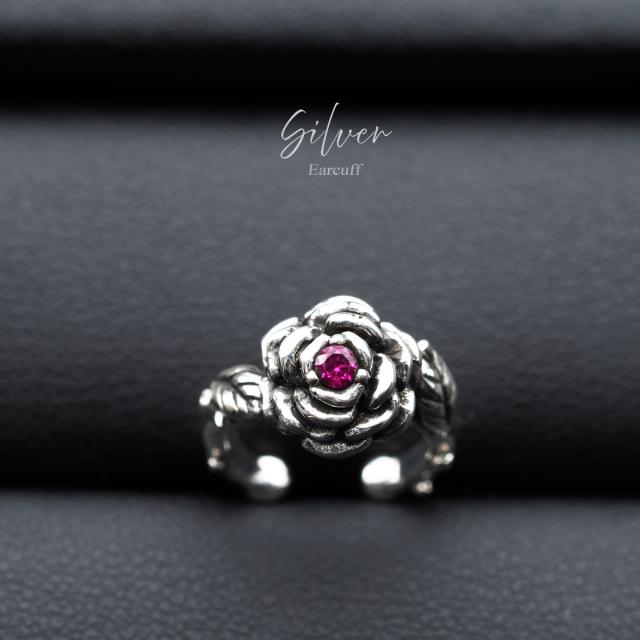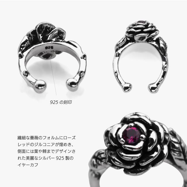 繊細な薔薇のフォルムにローズレッドのジルコニアが煌めき、側面には葉や棘までデザインされた美麗なシルバー925製のイヤーカフです。優雅に咲く薔薇の華やかさ、気品とミステリアスな雰囲気を纏う魅惑的なデザイン。薔薇は美と情熱の象徴で、主役級のアクセントとして幻想的な世界観を演出できるアイテムです。クラシカルなエレガンスからロックテイストまで、幅広いスタイルにも馴染み、耳元を華やかに彩ります。ピアスホール不要のイヤーカフなので簡単に装着でき、着けやすいアクセサリー。素材は、ニッケルフリーで本格的な仕様のシルバー925で作られています。