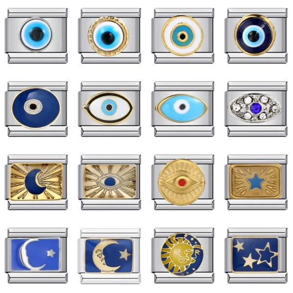 ステンレス鋼のブレスレット,チャーム,青い釉薬,目,太陽,月,星,イタリアのリンク,ジュエリー作り,9mm,新しいファッション,2022