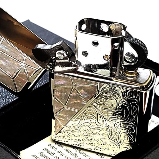 ZIPPO ライター トライアングル アラベスク ホワイトシェル模様 ジッポ 鏡面仕上げ 彫刻 シルバー かっこいい おしゃれ メンズ