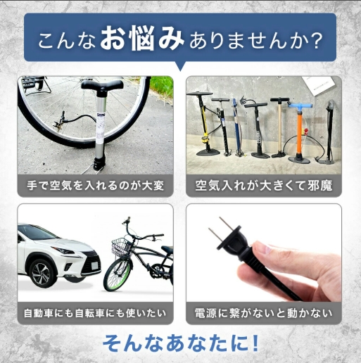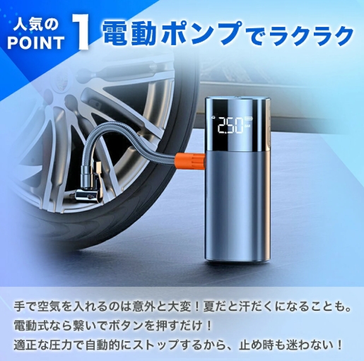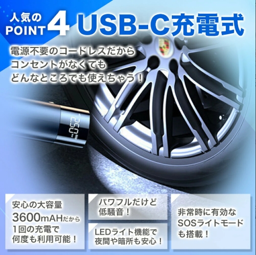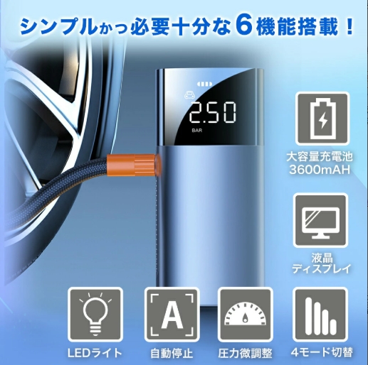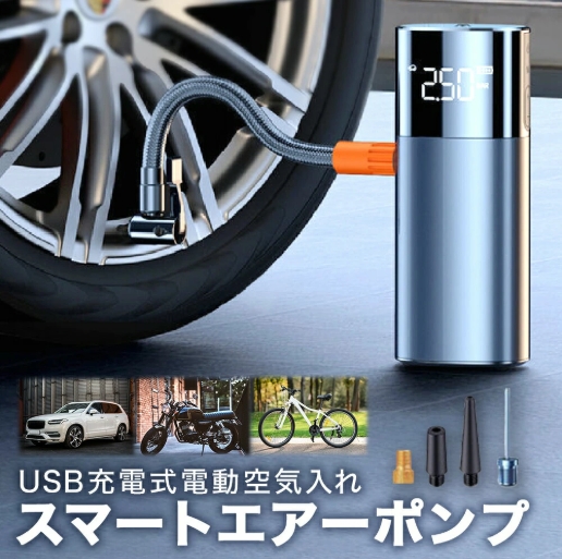 充電式 電動 エアーポンプ 自動車 バイク 自転車 タイヤ 用 携帯 持ち運び 空気 入れ コンプレッサー 米式 英式 バルブ 対応 アダプター 4種類 ボート プール 浮き輪 ボール 軽量 小型 コンパクト 簡単 操作 自動 停止