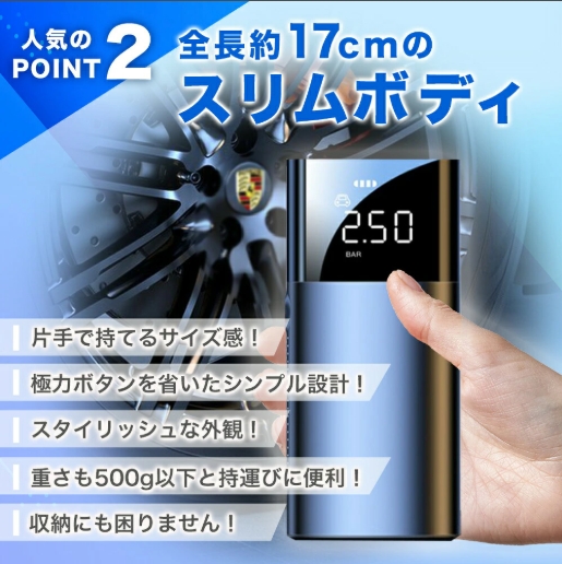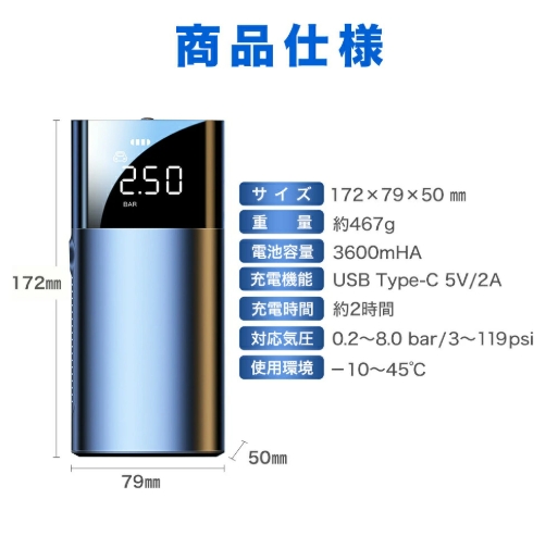 商品仕様 サイズ 172 x 79 x 50 mm 重量 約467g 電池容量 3600mHA 充電機能 USB Type-C 5V/2A 充電時間 約2時間 対応気圧 0.2〜8.0 bar / 3〜119psi 使用環境 -10〜45℃