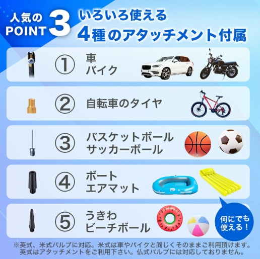 いろいろ使える! 4種のアタッチメント付属! 1.車・バイク 2.自転車のタイヤ 3.バスケットボール、サッカーボール 4.ボート・エアマット 5.うきわ・ビーチボール 何にでも使える! ※英式、米式バルブに対応。米式は車やバイクと同じくそのままご利用頂けます。英式はアタッチメントをご利用下さい。仏式バルブには対応しておりません。