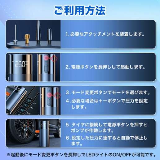 1必要なアタッチメントを装着します。 2電源ボタンを長押しして起動します。 3モード変更ボタンでモードを選びます。 4必要な場合は+ーボタンで圧力を設定します。 5タイヤに接続して電源ボタンを押すとポンプが作動します。 6設定した圧力に達すると自動で停止します。 ※起動後にモード変更ボタンを長押しでLEDライトのON/OFFが可能です