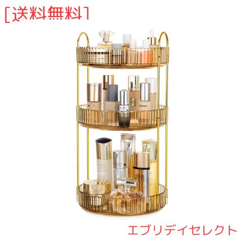 コスメ収納 360回転式 化粧品収納ボックス 小物入れ 大容量化粧台 洗面所収納ボックス 整理簡単 多機能 化粧品 収納 (3層 ゴールド)