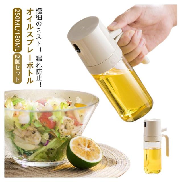 | 極細のミスト! 漏れ防止! オイルスプレーボトル 250ml/180ml 【2個セット】 3D立体広角スプレーで、食べ物を均一にかぶせます。 注ぎ口は突出した設計をしており、ポット本体にオイルがつきにくくて、常に洗浄する必要はありません。 高ほう素シリコンガラスの材質で、耐久性抜群です。 大口径設計、オイルの入るのがもっと簡単で、周りを汚すことを避けます。 <お勧めのポイント> ●均一な霧化 スプレーボトルを押すだけで細かいミストが均一に広がる 必要な油の量を正確にコントロール 過剰使用を回避、より健康的な料理を作れる ●透明なガラス製 ハンドルを持ちやすい 人間工学に基づいたデザインで 残量チェックがラクラク! 変形しにくく、 有害物質が出にくい安心のガラス製 ●ダブル漏れ防止設計 厚手シリーコンリングを設置 倒れても油が漏れない設計で料理や周囲を汚すことない リークプルーフデザインで密閉性を高め、液漏れを防止! ●最後の一滴まで無駄なく使い切る設計 効率的にオイルを利用でき 古い油と混ざる心配がない ポンプをノズル側に配置することで、底に残ったオイルもしっかり吸引 | |