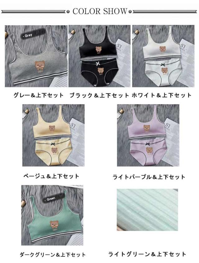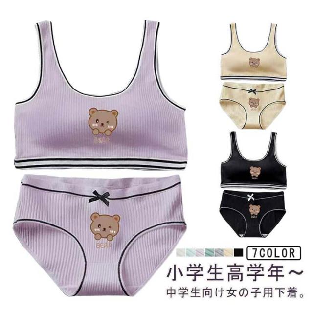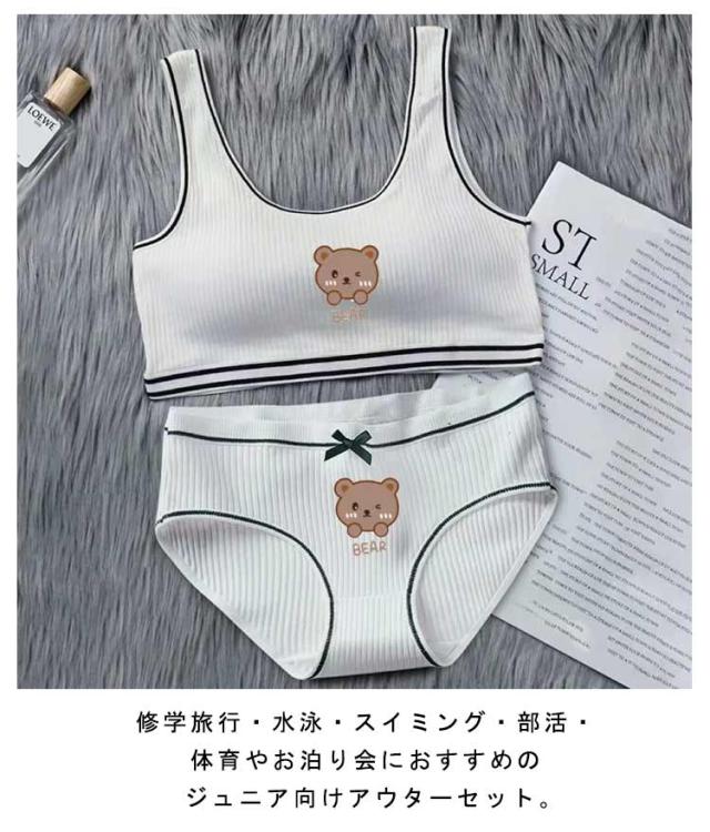 | 小学生高学年〜中学生向け女の子用下着。 スポーツブラとパンツの上下2点セットです。 綿素材で気持ちいい肌触り。 修学旅行・水泳・スイミング・部活・体育やお泊り会におすすめのジュニア向けアウターセット。 伸縮性のあるノンストレスな着心地。 ファーストブラにおすすめ、パット入りなので安心。 新学期や新年に向けて新しい下着セットは色違いでも欲しくなっちゃう! | |