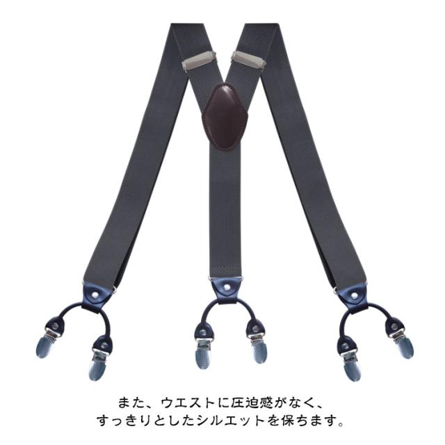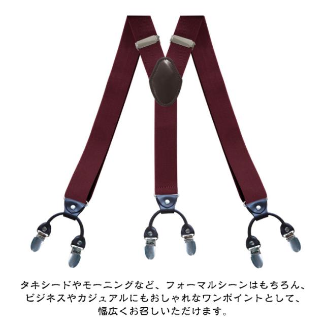 | 35mm幅、長さは調整できる、身長160~190cmお勧め~ シーンに合わせた豊富なカラーバリエーション。 サスペンダーはウエストラインが持ち上がるので、脚長効果もあります。 また、ウエストに圧迫感がなく、すっきりとしたシルエットを保ちます。 クロス部分は精製皮革を採用して、普通の合成皮革とは違い、より光沢感があり、カビや虫食いの心配はしません。 クリップは部分はステンレス鋼で、長時間使ても錆びにくい。 タキシードやモーニングなど、フォーマルシーンはもちろん、 ビジネスやカジュアルにもおしゃれなワンポイントとして、幅広くお召しいただけます。 | |