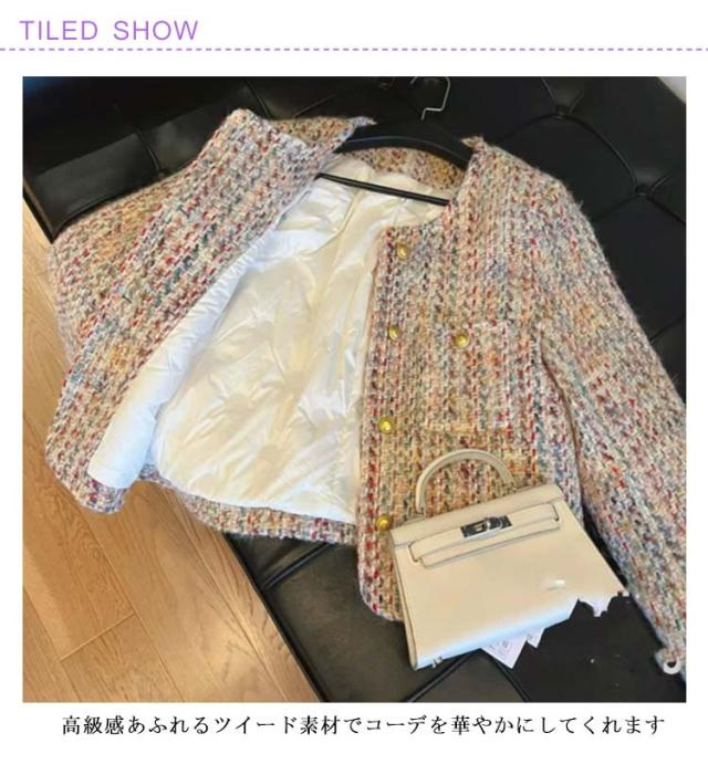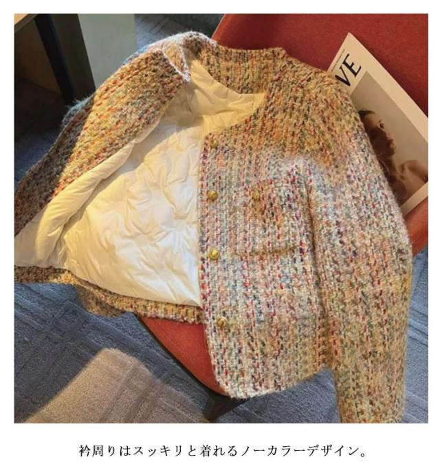 春 ツイードジャケット 秋 ショート丈 レディース 金ボタン ノーカラー ツイード アウター ジャケット カラフル ツイードジャケット レトロ ゴールドボタン 可愛い 通勤 上品 虹色 オフィス カジュアル 大人 ポケット付き おしゃれ 2025 韓国 ファッション