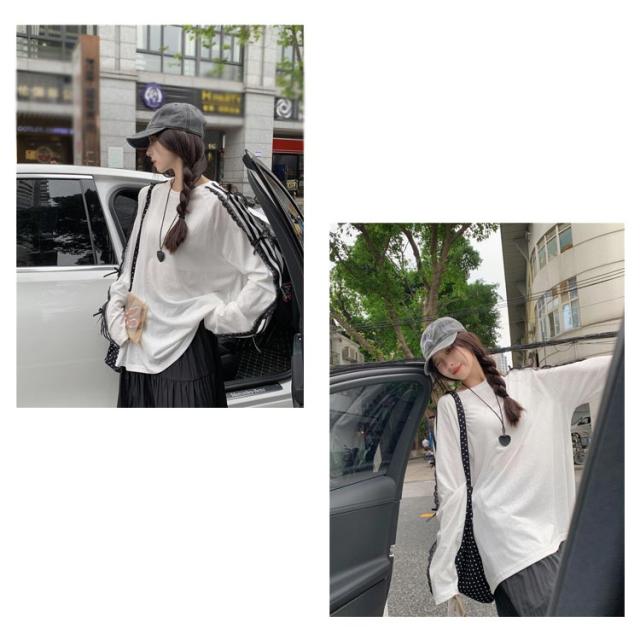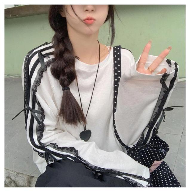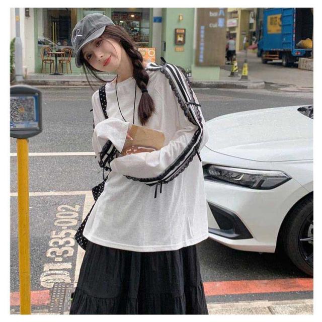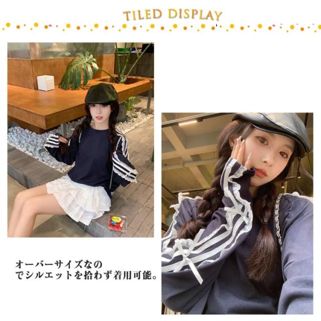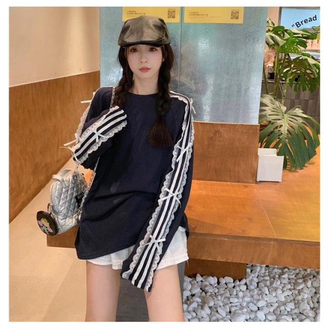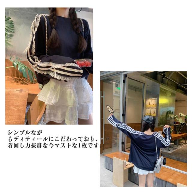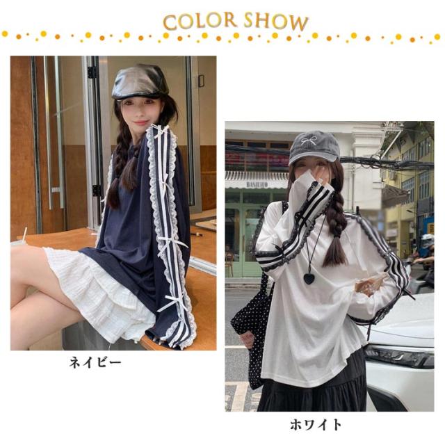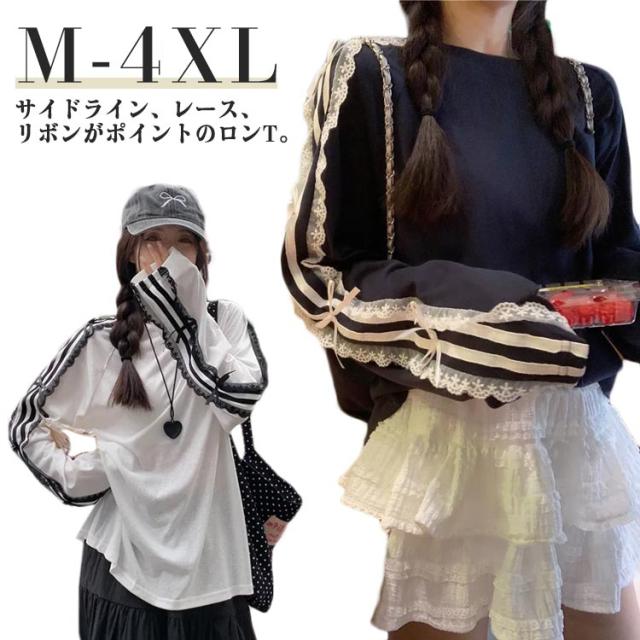 Tシャツ ロンt 韓国ファッション 長袖Tシャツ レース サイドライン トップス Tシャツ tシャツ オーバーサイズ レディース 無地 可愛い おしゃれ リボン 体型カバー カジュアル 大きいサイズ 春 春服