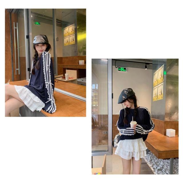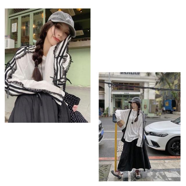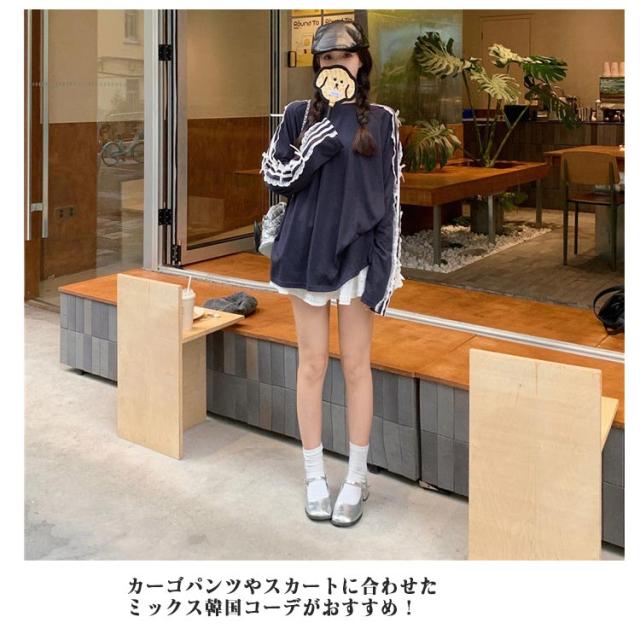 | サイドライン、レース、リボンがポイントのロンT。 オーバーサイズなのでシルエットを拾わず着用可能。 カーゴパンツやスカートに合わせたミックス韓国コーデがおすすめ! シンプルながらディティールにこだわっており、着回し力抜群な今マストな1枚です。 | |