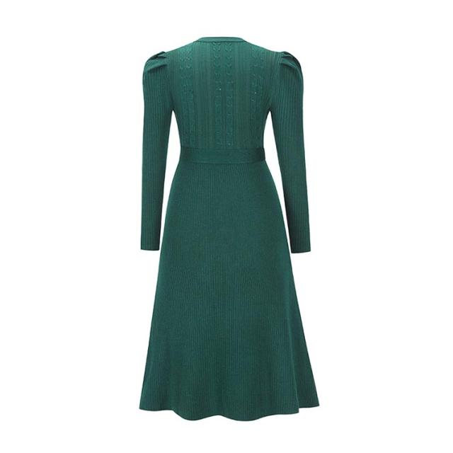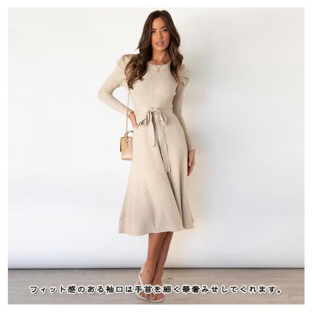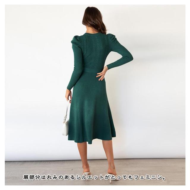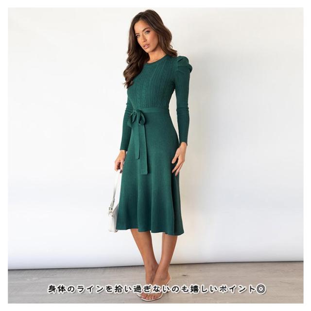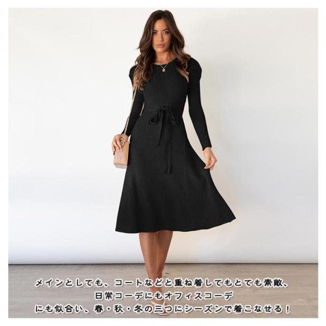 ワンピース Aライン ワンピ ニットワンピース ニットワンピース ニットワンピ ニット ウエストシェイプ タイト リブニット 伸縮性 袖リブ 切り替え 共布ベルト 軽量 体型カバー 無地 ケーブル編み きれいめ フェミニン 送料無料 ブラック グリーン レッド グレー