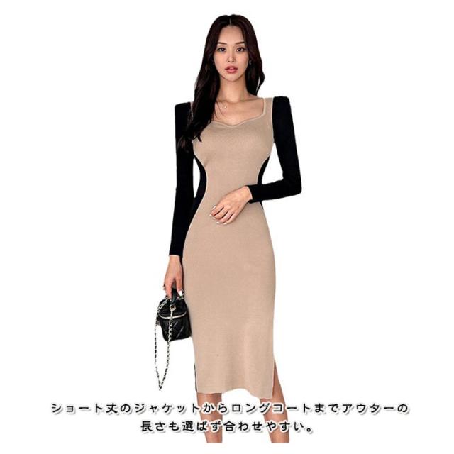 スリム 切り替え 配色ワンピース ニットワンピ タイト 長袖 デコルテ 配色ワンピース ニットワンピース Vネック タイト 上品 鎖骨 細身 リブニット レディース ワンピ パーティドレス サイドスリット 綺麗め 細身 シンプル