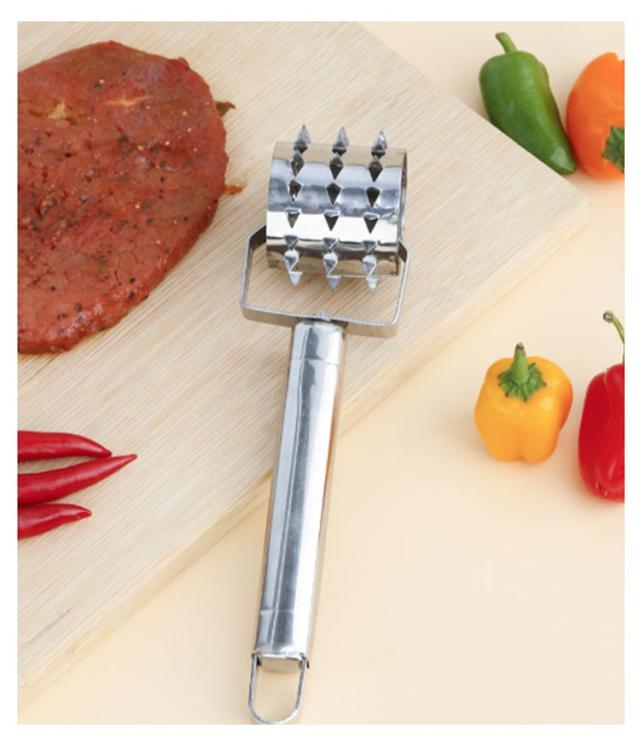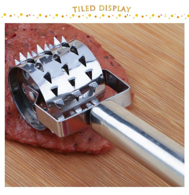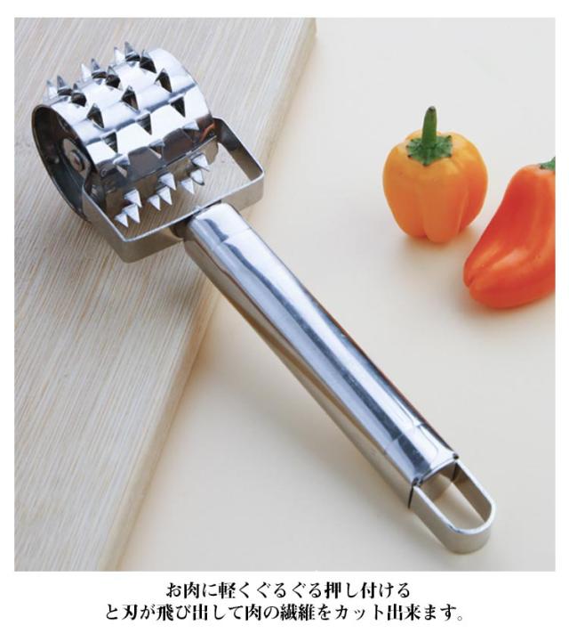 | ぐるぐる回転するだけで肉のスジがカット出来る肉すじ切りです。 お肉に軽くぐるぐる押し付けると刃が飛び出して肉の繊維をカット出来ます。 お肉のスジを切ることで、柔らかく食べやすくなります。 ちょっとのひと手間で上質な仕上がりになり、美味しいお肉料理をお楽しみ頂けます。 ステンレス素材なので、酸に強く、錆びにくく、お手入れしやすく衛生的で、丈夫なので長く愛用していただけます。 | |