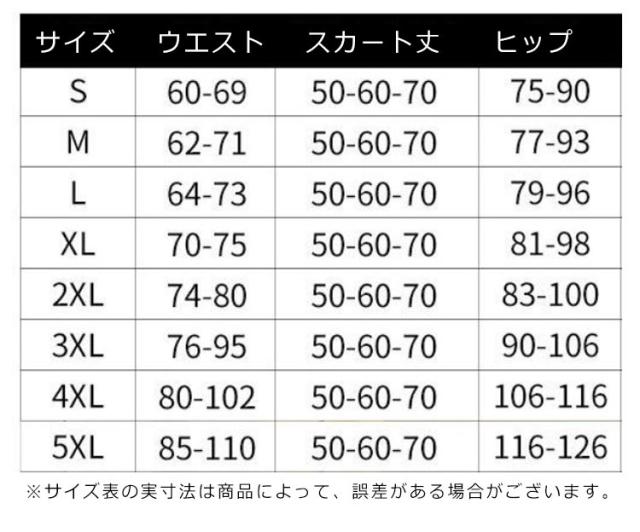 | サイズについての説明 | サイズ ウエスト スカート丈 ヒップ ※サイズ表の実寸法は商品によって、誤差がある場合がございます。 |