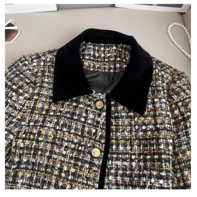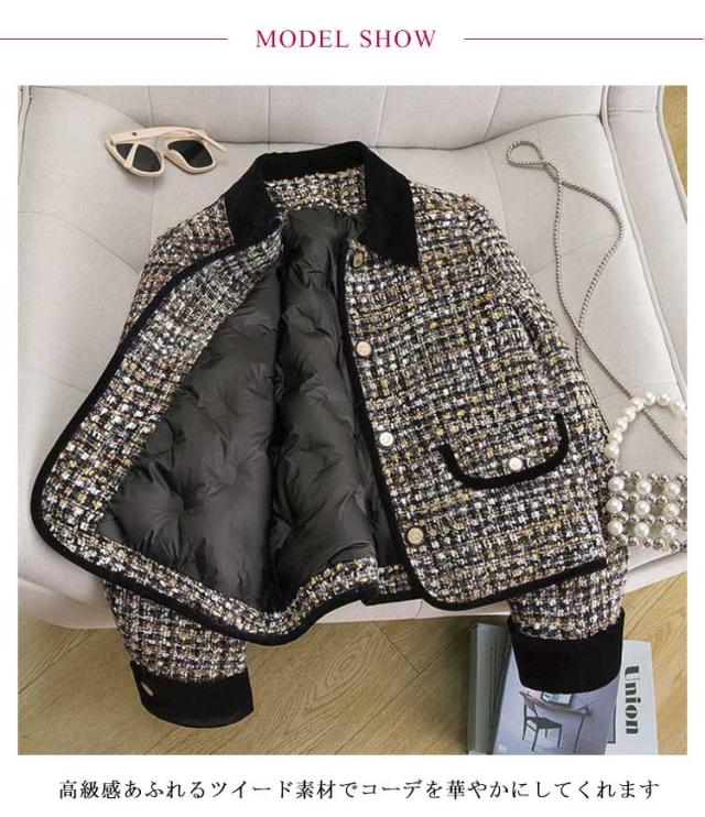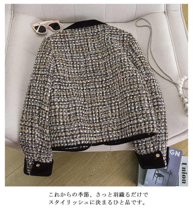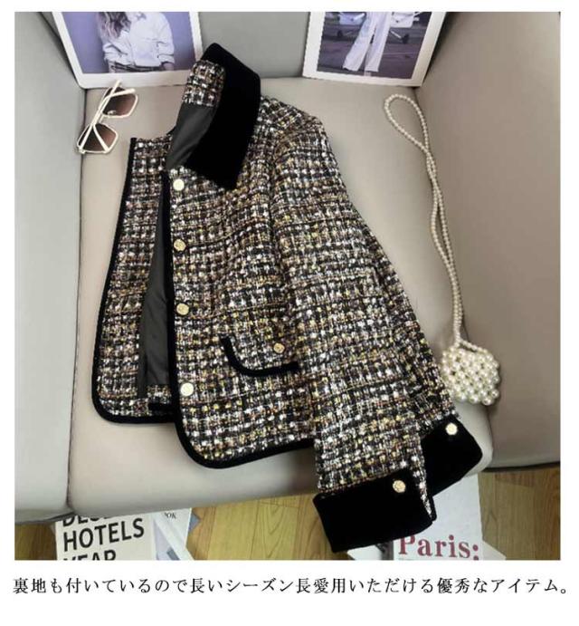 ツイードジャケット 襟付き ショート丈 フラップポケット ジャケット レディース 配色 衿付き パイピング 黒 秋 アウター レトロ ゴールドボタン 金ボタン 春 上品 通勤 カジュアル 大人 可愛い おしゃれ ツイードジャケット 韓国 ファッション 裏地付き