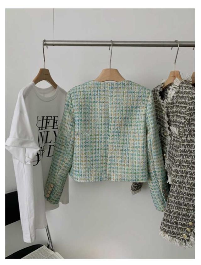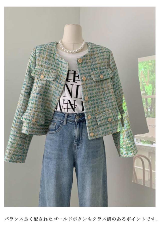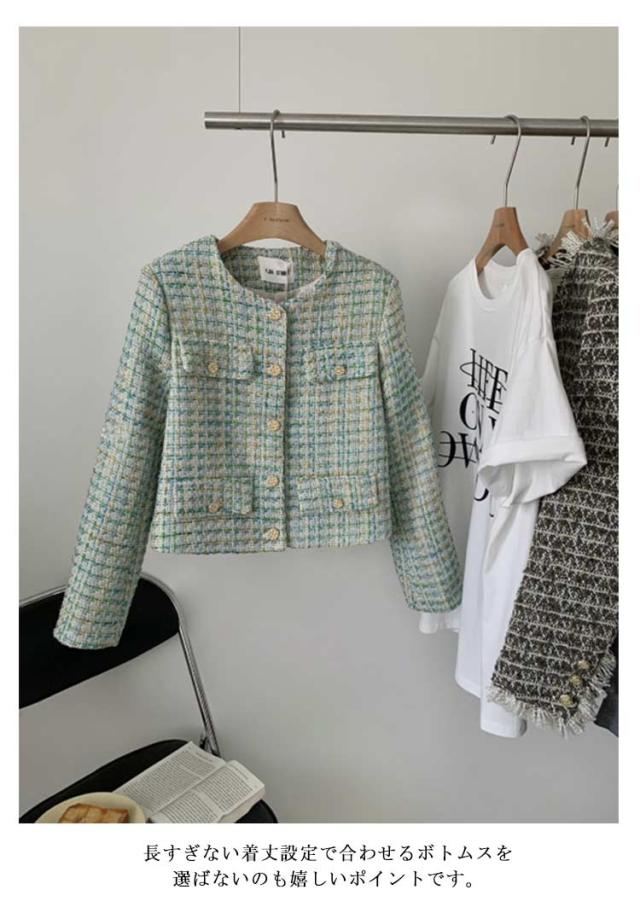 ゴールドボタン ノーカラー グリーン ジャケット レディース 春 秋 ノーカラージャケット ツイード 可愛い 春アウター 上品 金ボタン ショート丈 通勤 オフィス カジュアル 大人 2025 きれいめ フェミニン おしゃれ ツイードジャケット 韓国 ファッション