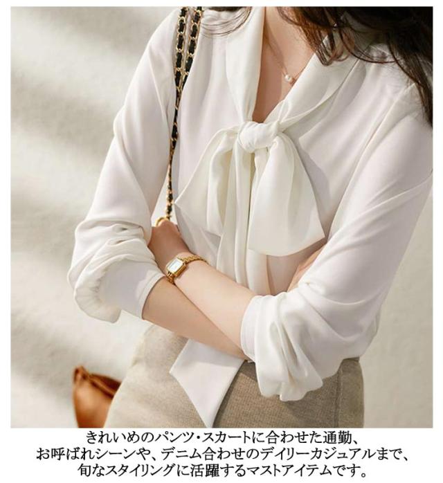 | 首元を華やかに!アレンジ可能なきれいめボウタイブラウス♪エレガントな着こなしボウタイブラウス。 シンプルだからパンツやスカートと合わせやすい◎ きれいめのパンツ・スカートに合わせた通勤、お呼ばれシーンや、デニム合わせのデイリーカジュアルまで、旬なスタイリングに活躍するマストアイテムです。 | |