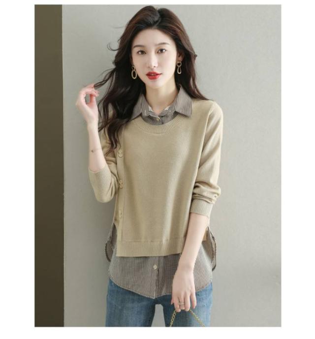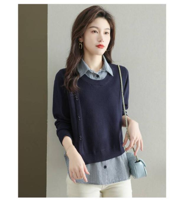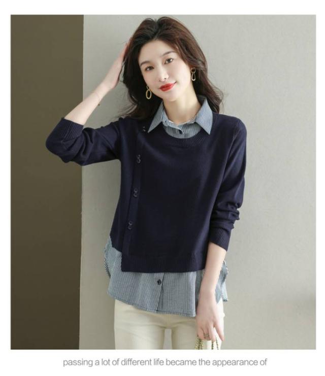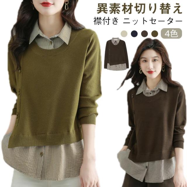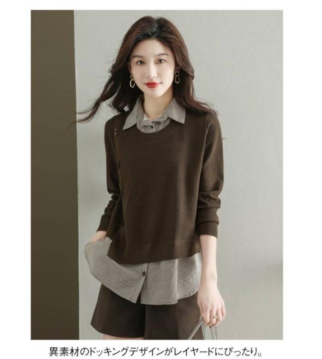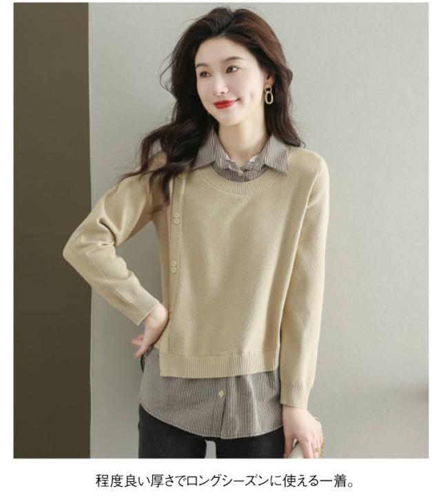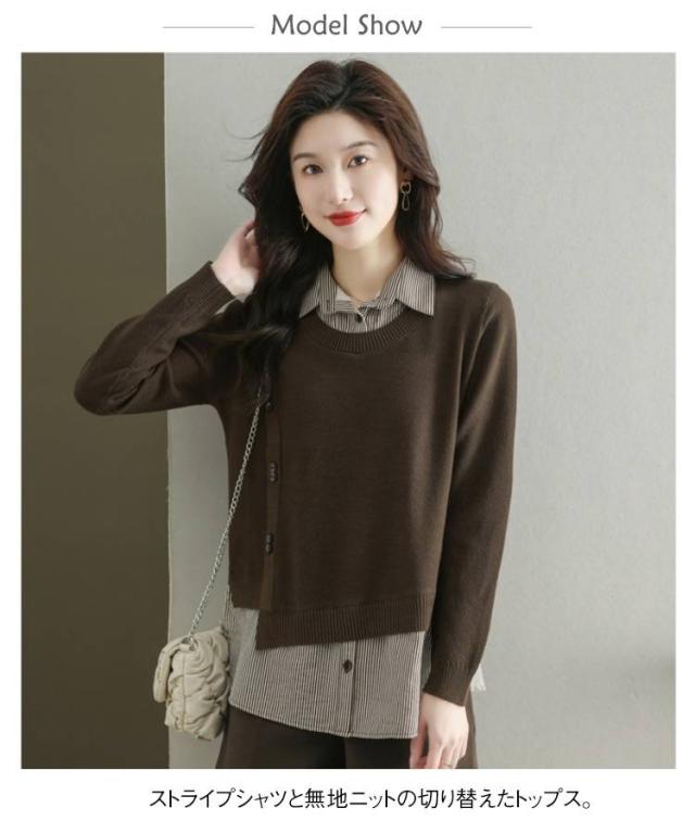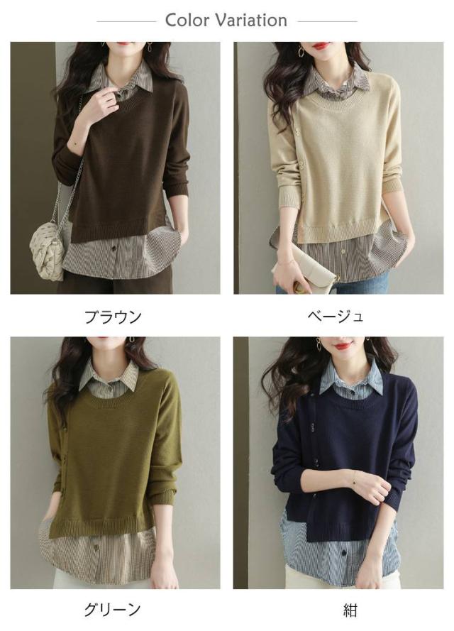 ストライプシャツ トップス 重ね着風 レイヤード カジュアル 通勤 セーター ニット 襟付き 大人可愛い ゆったり 30代 40代 春服 秋服 OL レディース 仕事