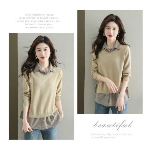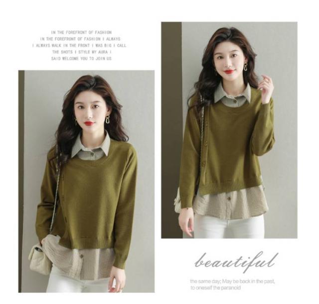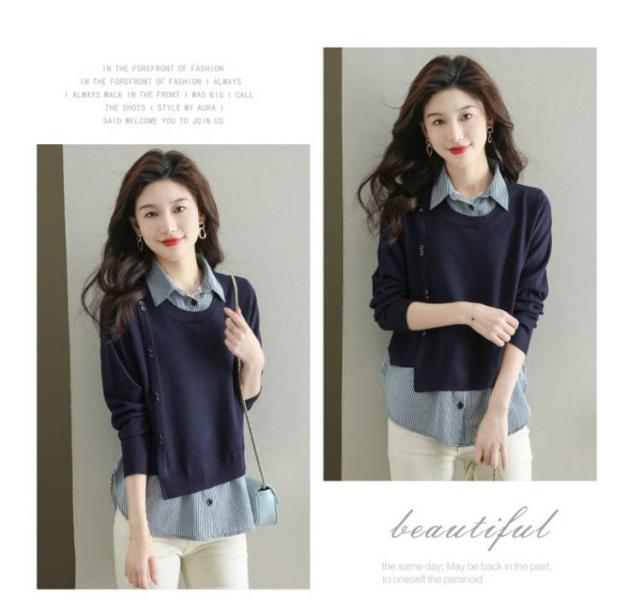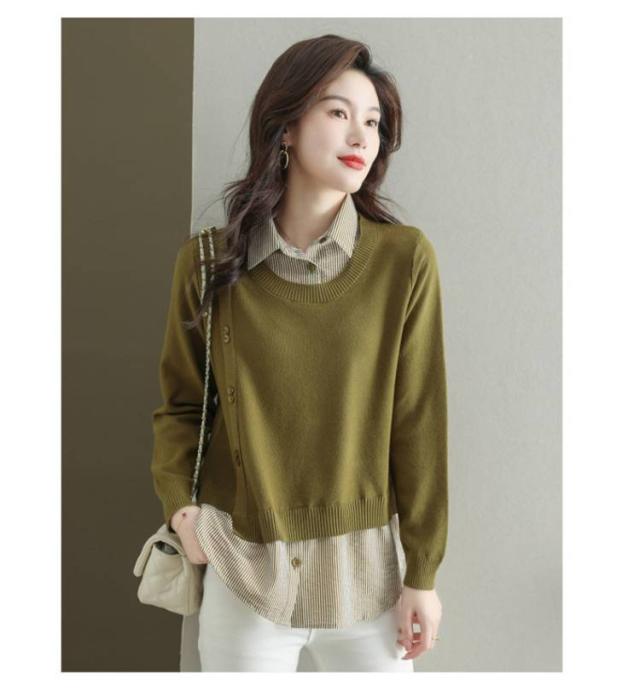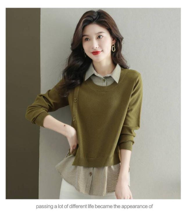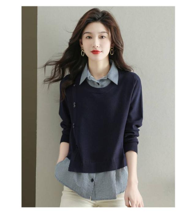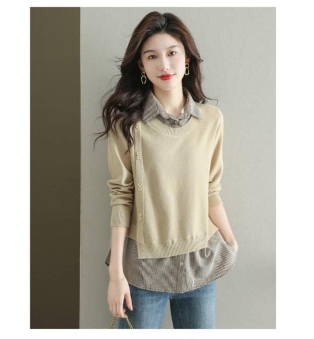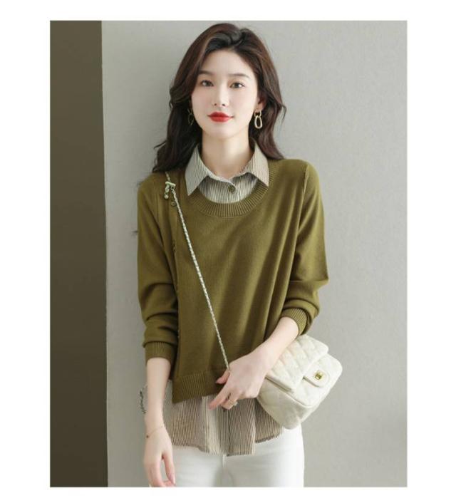 ストライプシャツ トップス 重ね着風 レイヤード カジュアル 通勤 セーター ニット 襟付き 大人可愛い ゆったり 30代 40代 春服 秋服 OL レディース 仕事