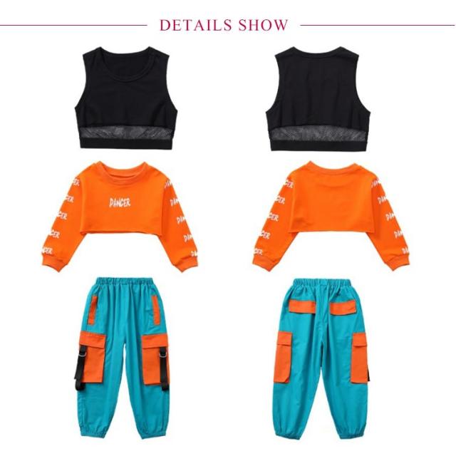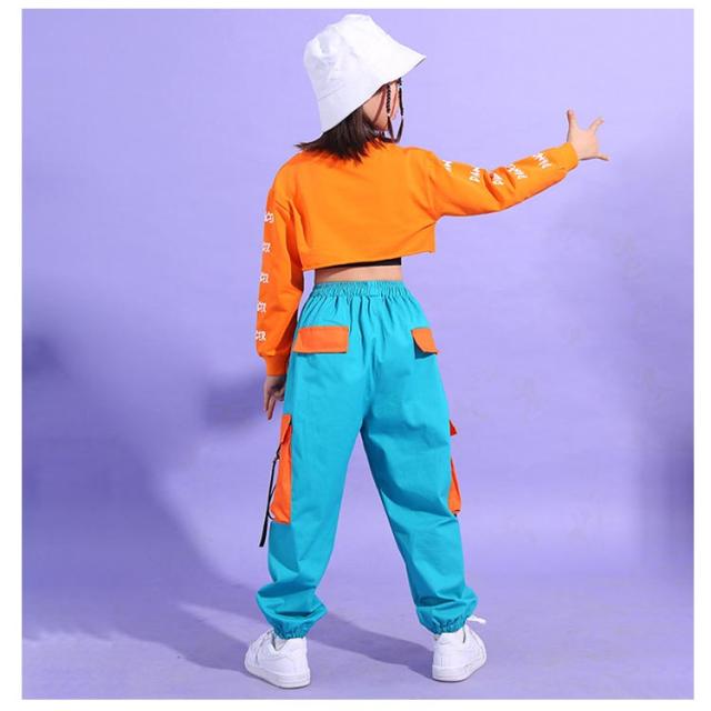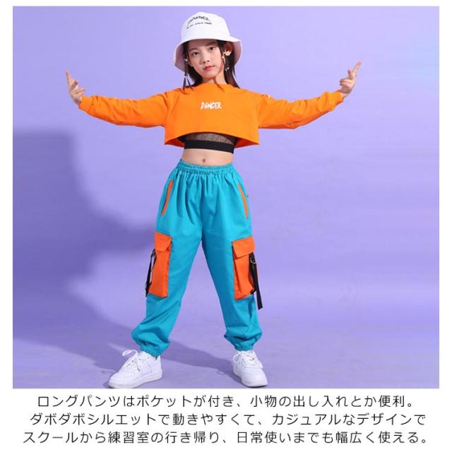 セットアップ キッズ ダンスウェア ブラトップ 3点セット 女の子 カーゴパンツ スウェット 上下セット ダンス 長袖 衣装 トップス トレーナー 練習着 メッシュ スポーツブラ hiphop インナー へそ出し キッズ ヒップホップ ジャズ ストリート オレンジ