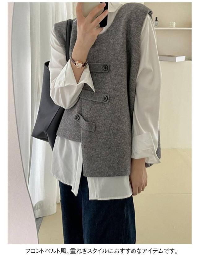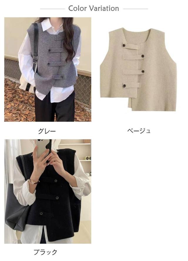 | アシメトリーシルエットのニットベスト。 フロントベルト風、重ねきスタイルにおすすめなアイテムです。 生地は柔らかくて通気性もよくて、オールシーズンに大活躍します。 | |