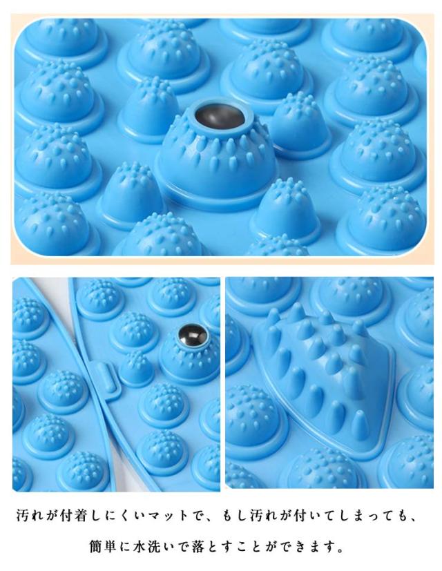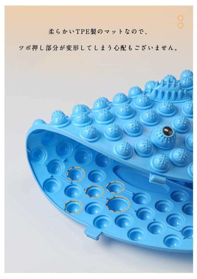 | 健康は足の裏から!日々の疲れを癒す足ツボマットです。 踏むだけで足の裏の反射区を刺激することで、新陳代謝と血液循環を促進します。 柔らかいTPE製のマットなので、ツボ押し部分が変形してしまう心配もございません。 玄関などに置いておくだけで、立ちっぱなしで仕事をした日や1日中歩き回った日に、家に帰ってから気軽に足裏マッサージます。 パソコンデスクやテーブルの下に、この足ツボ押しマッサージマットを置いて、座りながら気軽に足ツボマッサージをすることもできます。 パソコン作業などで座りっぱなしの方にもおすすめの足裏マッサージマットです。 汚れが付着しにくいマットで、もし汚れが付いてしまっても、簡単に水洗いで落とすことができます。 | |