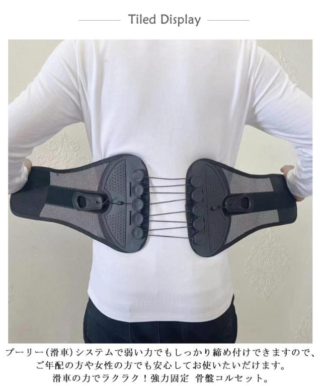 | プーリー(滑車)システムで弱い力でもしっかり締め付けできますので、ご年配の方や女性の方でも安心してお使いたいだけます。滑車の力でラクラク!強力固定 骨盤コルセット。 軽い力で引っ張るだけ!滑車滑車の原理で軽い力でもしっかり引き締め固定します。通常のコルセットでは力が入らず難しかった固定が簡単にできるのでズレることなく安定!サイズが合わず悩んでいた方にもオススメです。 着脱カンタン!着脱の難しいホックはなし!強力なマジックテープ仕様なので、簡単にしっかりと固定できます。 いつでも気軽に着用!腰痛が気になる方、腰に負担がある作業をする方、産後の骨盤ケアに、家事や仕事をしながら体型改善! 右手側のヒモを引くと上側が、左手側のヒモを引くと下側を締め付けます。上下それぞれで最適な締め具合に調整いただけます。 幅広タイプなので腰から骨盤まで広範囲をサポートします。 メッシュ素材で通気性バツグン。蒸れないから夏場でも快適にお使いいただけます。 | |